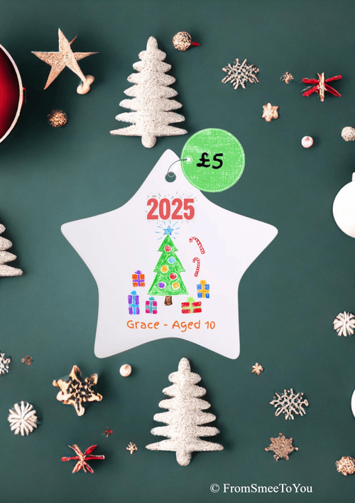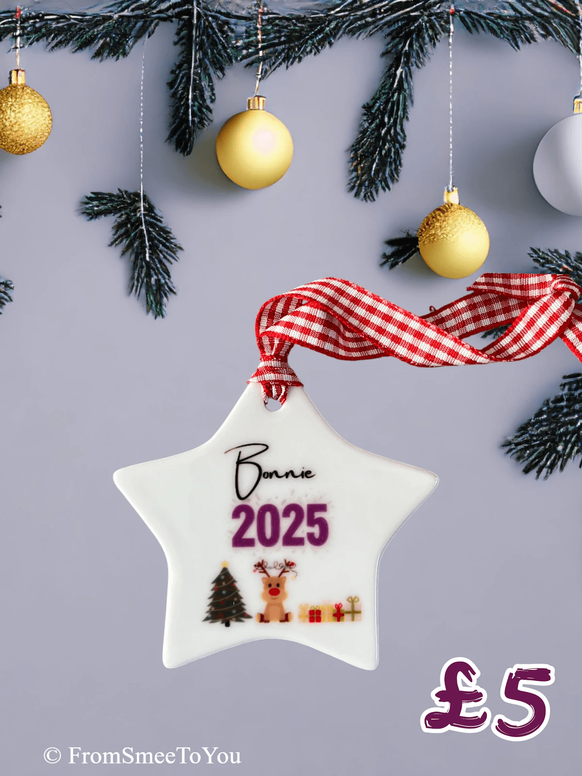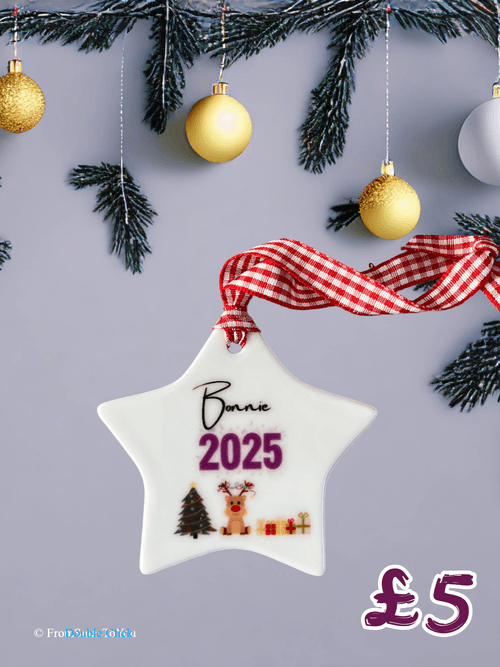 Add a touch of magic with our personalised hanging ceramic star! Customise it with any name, date, or design — the perfect way to celebrate a special milestone, like ‘the year I started school’, a first Christmas, or a new home!